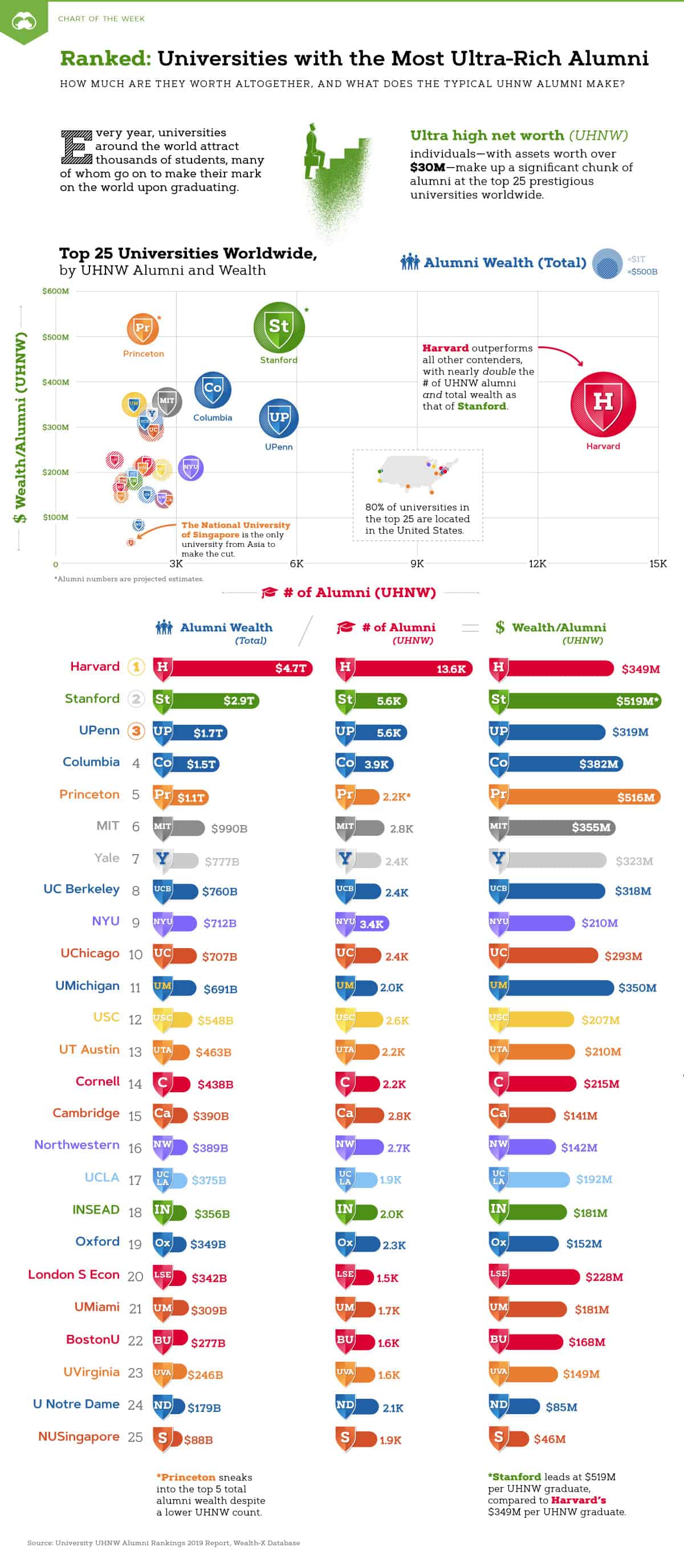 With a new fall term just around the corner, today’s chart relies on the third annual Wealth-X report ranking of global universities with the most ultra-high net worth (UHNW) alumni. We’ve also tracked their combined wealth, and how much each UHNW alumni makes on average.