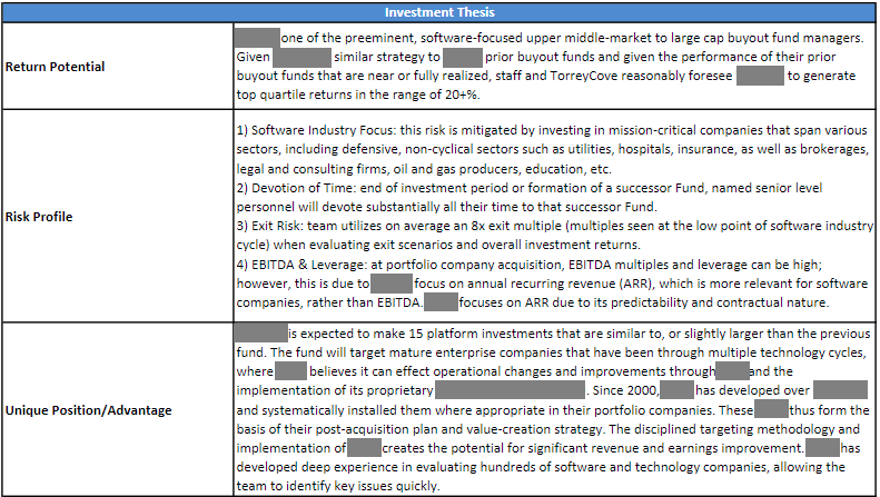 Before a commitment is made, Investment Staff at public plans will submit investment recommendations to the Investment Committee or Investment Board. These detailed documents are incredibly insightful in understanding exactly why a commitment was made to a specific fund manager.