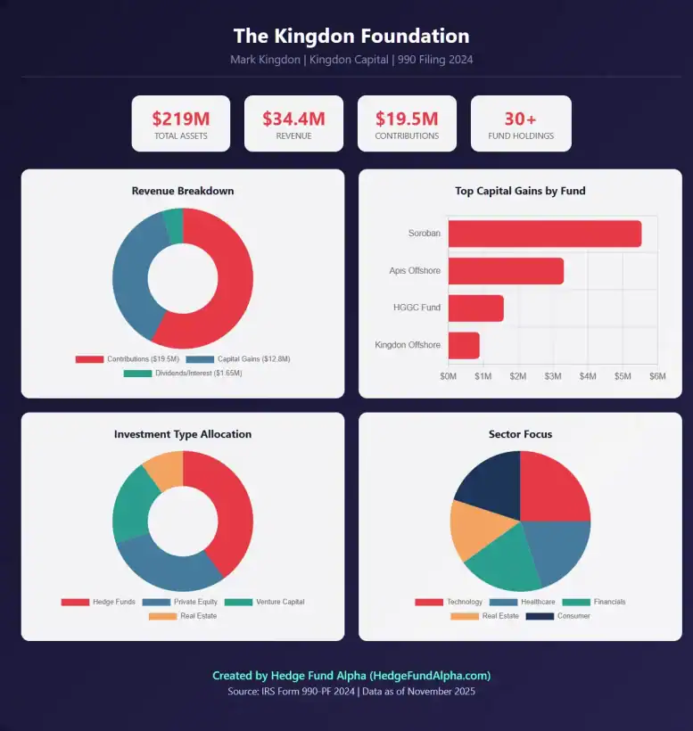 Mark Kingdon donated $19.48 million to the foundation, while the remaining revenue came from dividends and interests from securities ($1.65 million) and capital net gains from asset sales ($12.80 million).