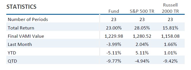 Alluvial Fund, LP was down 4.0% in November. Year-to-date, Alluvial has returned -5.1% versus 5.1% for the S&P 500 and 1.0% for the Russell 2000. Since inception, Alluvial Fund, LP has returned 23.0% compared to 28.1% for the S&P 500 and 15.8% for the Russell 2000.