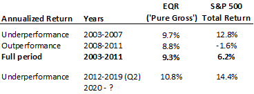 We have also seen the relative underperformance and subsequent outperformance movie before. The following table illustrates our other major period of market underperformance, and what happened next.