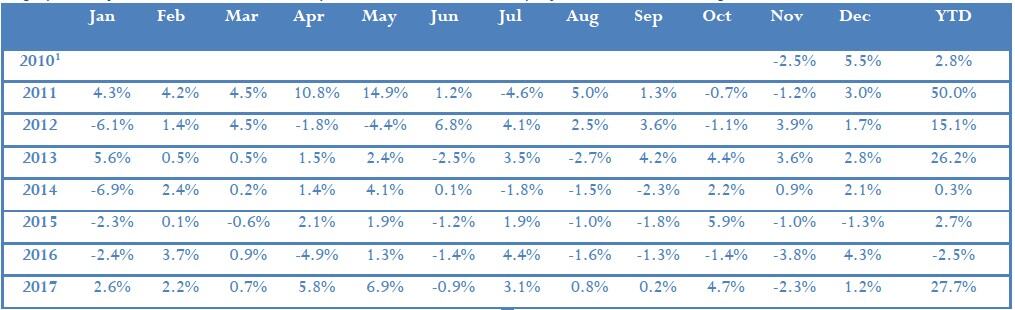 The fund gained just over a percent in December, falling slightly behind what was yet another positive month for global stocks. For the quarter it rose by 3.3% and by 27.7% for the calendar year. Indeed, this year’s results are astonishing given our positioning. There is a raging bull market, we run a large short book and we have roughly broken even on the shorts. We run more than 100 percent long, did not lose money on our shorts and our longs have performed okay so we have outperformed long only global indices. Winners for the quarter included Interactive Brokers and MTU on the long side, but pleasingly one of the top 3 winners for the quarter was a short (the South African retailer Steinhoff which has imploded with disclosures of “accounting irregularities”).