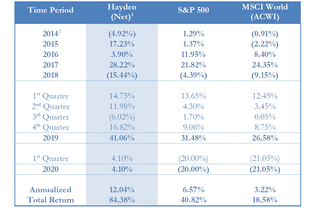 Hayden Capital commentary for the first quarter ended March 31, 2020.