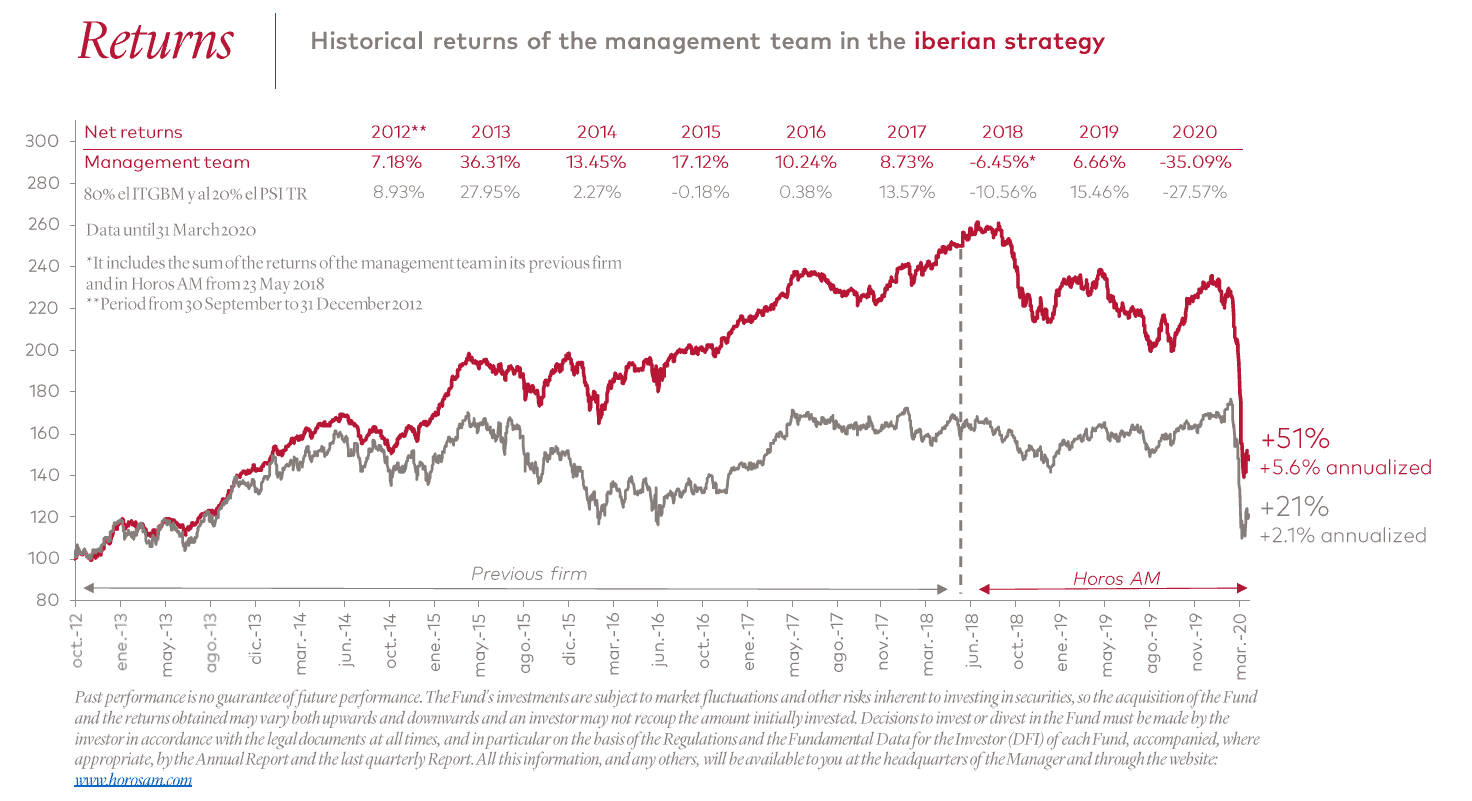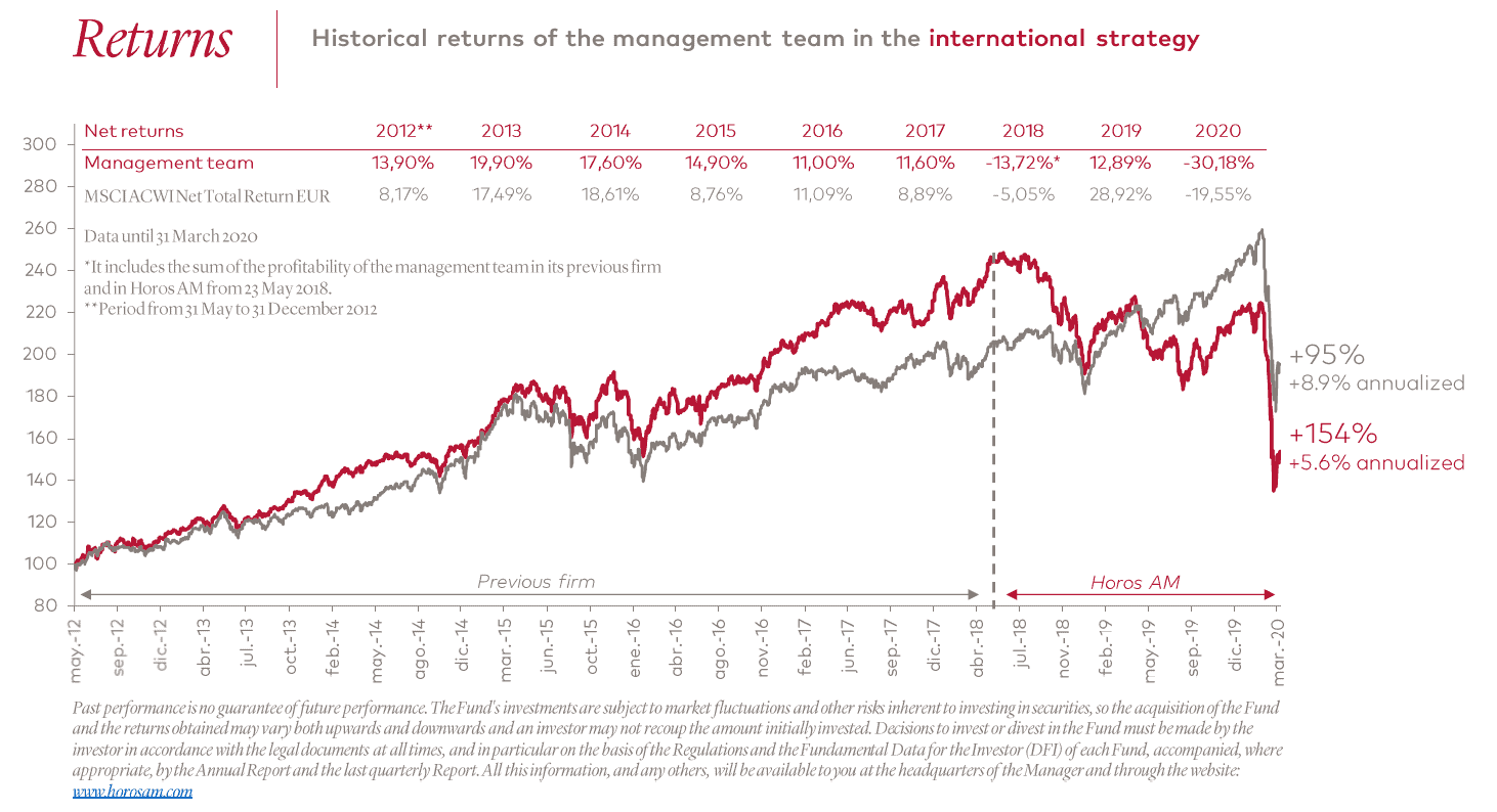 This quarter has been characterised by a sharp market downturn, as a result of investors' panic and increased demand for liquidity, in the face of economic uncertainty due to the coronavirus pandemic. Thus, Horos Value Iberia fell by -35.1% compared to -27.6% of its benchmark index. On the other hand, Horos Value Internacional was down by -30.2% compared to -19.6% of its benchmark index.