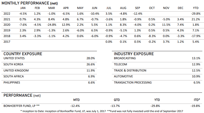 Bonhoeffer Fund September 2022 Performance Update