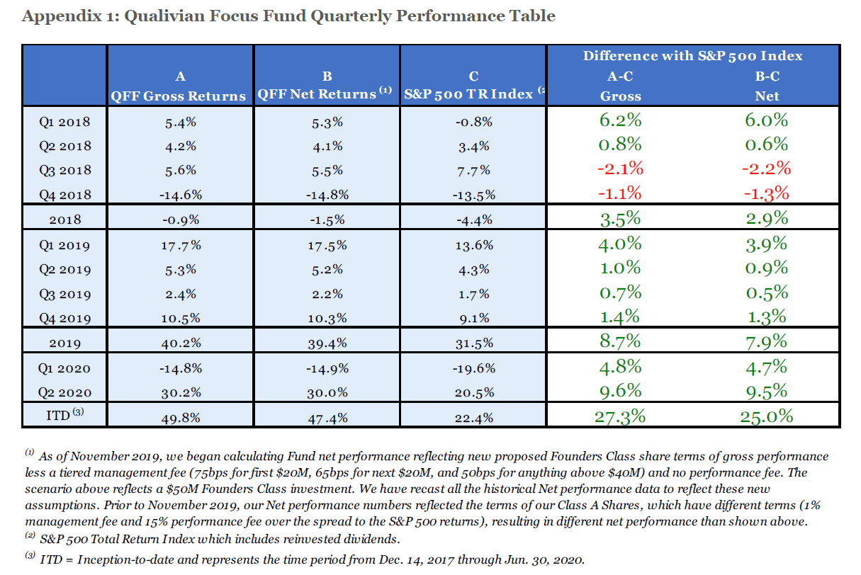 “Our performance in Q2 was ahead of the S&P 500 by 9.6% and 9.5% on a gross and net basis. Since inception through Q2 2020, we have outperformed by...