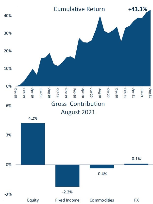 Entering September, Trident is in a balanced Risk Regime model position with large exposures to stocks and bonds. It is long the dollar and short gold, while long the rest of its commodity exposure, expecting persistent inflation.