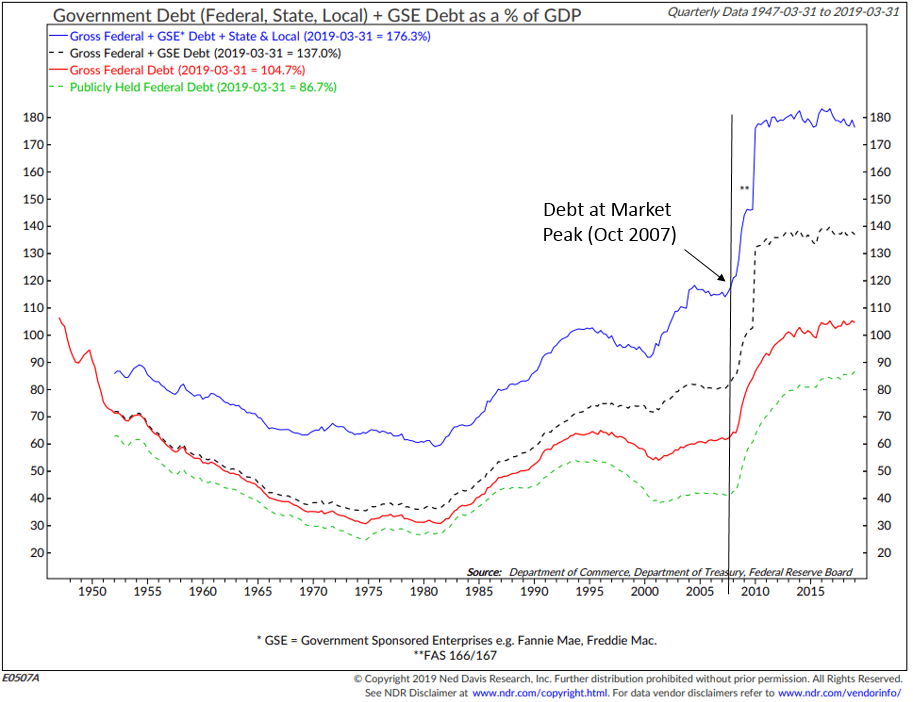 The next chart takes a look at Gross Federal Debt as a percent of GDP. The debt level as a percent of GDP in 2000 was approximately 100%. It was approximately 118% in 2007. It was 176.3% debt-to-GDP at the end of March 2019. Lift the debt ceiling, my friends. It’s going up and when recession comes, it worsens quickly.