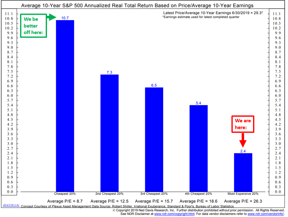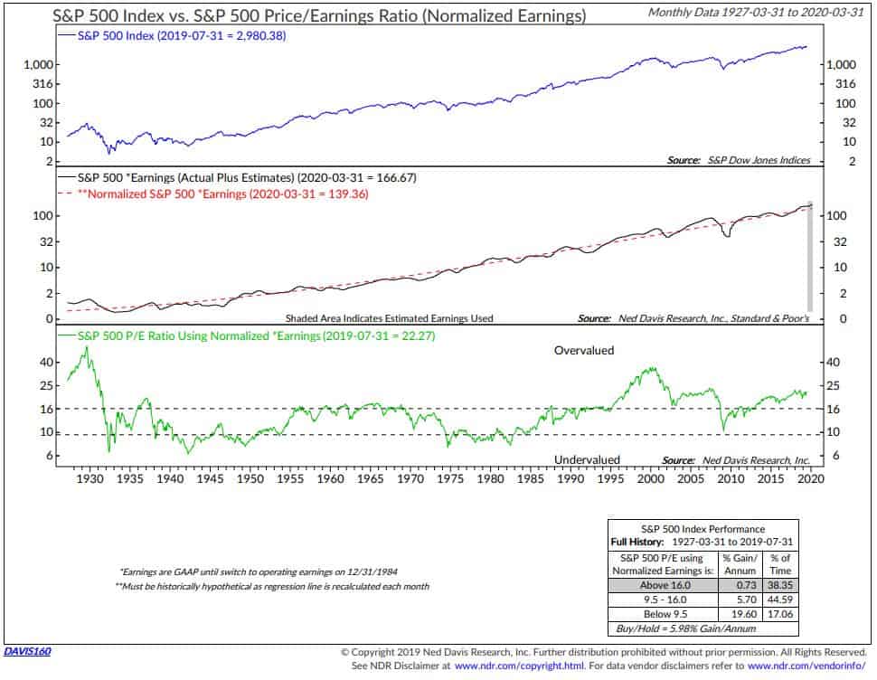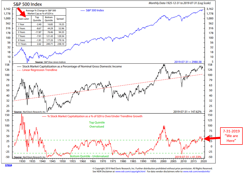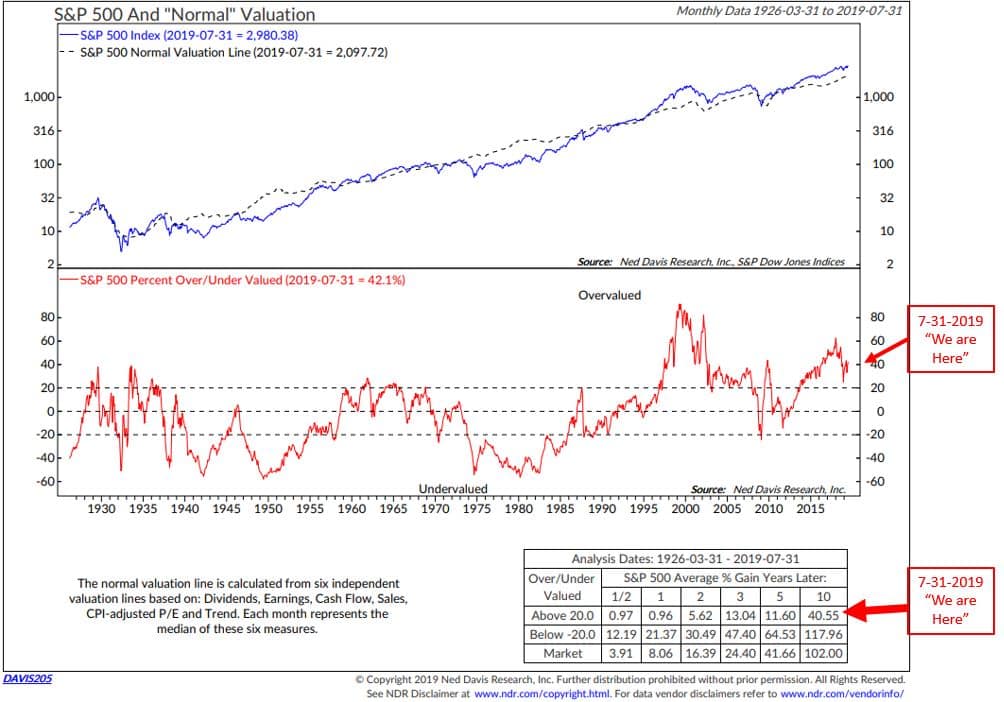 - The red “We are Here” arrow points to 7-31-2019 Median P/E. NDR says it is in the extremely overvalued zone (see dashboard above).