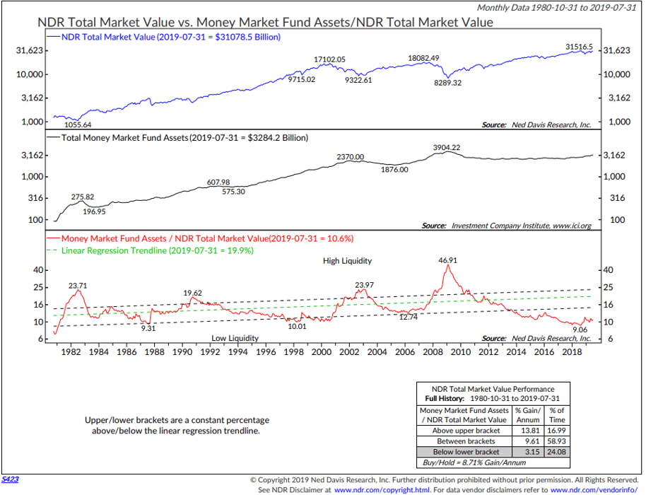 - Focus in on the red line in the lower section of the chart. It plots Money Market Fund Assets to NDR Total Market Value (The upper section of the chart shows you the Total Market Value (NDR calculation) is $31.1 trillion. The second section shows Money Market Fund Assets.
