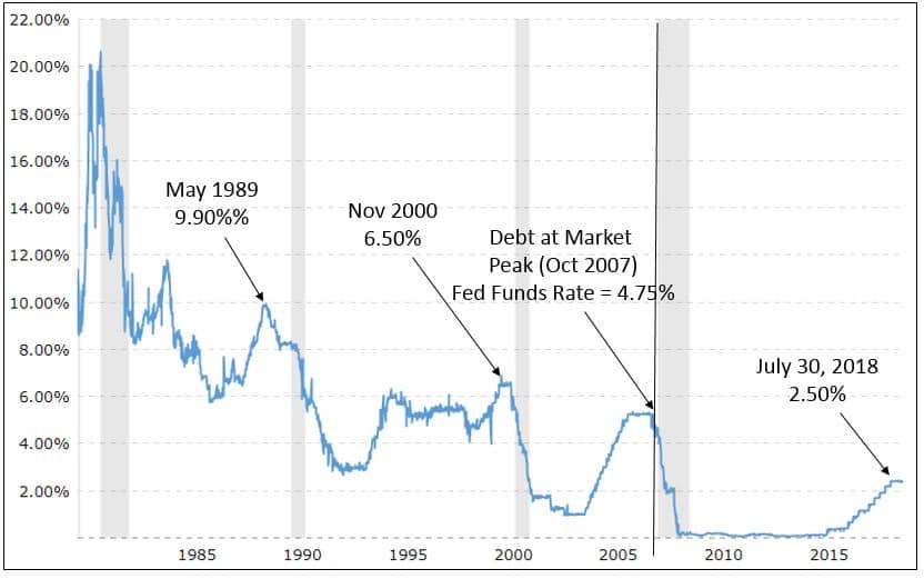 - Second, note that following the May 1989 cut, the Fed went on to drop rates all the way from 9.90% to 3%. That’s a lot of fire power in their tool kit to help the economy. In the next chart, I want you to note the level of debt then vs. now (set that aside for just a second).