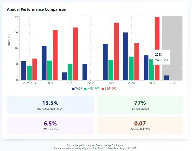 Walleye maintains a beta to the S&P 500 of just 0.07 essentially zero correlation with equity markets. This characteristic proved particularly valuable during 2022's market downturn, when the fund posted a positive 8.1% return while the S&P 500 declined significantly.