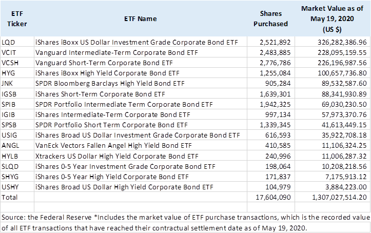 The Federal Reserve announced on March 23rd that it would purchase corporate bonds for the first time in its 107-year history. The Federal Reserve Bank of New York announced that the Secondary Market Corporate Credit Facility (SMCCF) will begin purchases of exchange traded funds (ETFs) on May 12th.