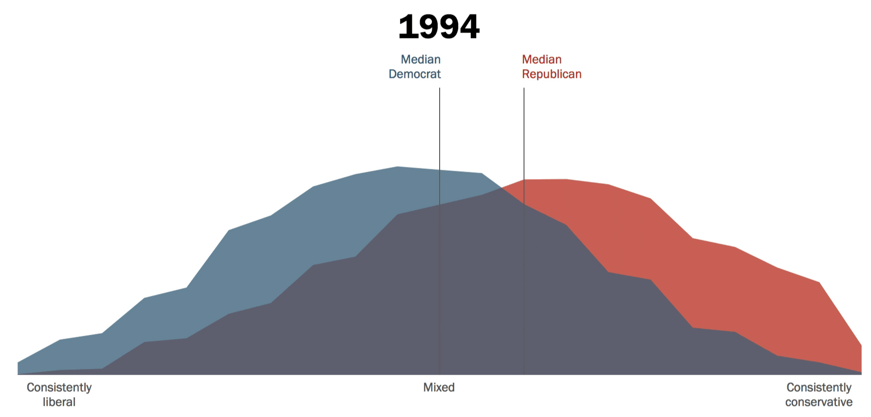 The animation above demonstrates how the political divide by party has grown significantly and consistently over 23 years. In 1994, the general public was more mixed in their allegiances, but a significant divergence started to occur from 2011 onward.