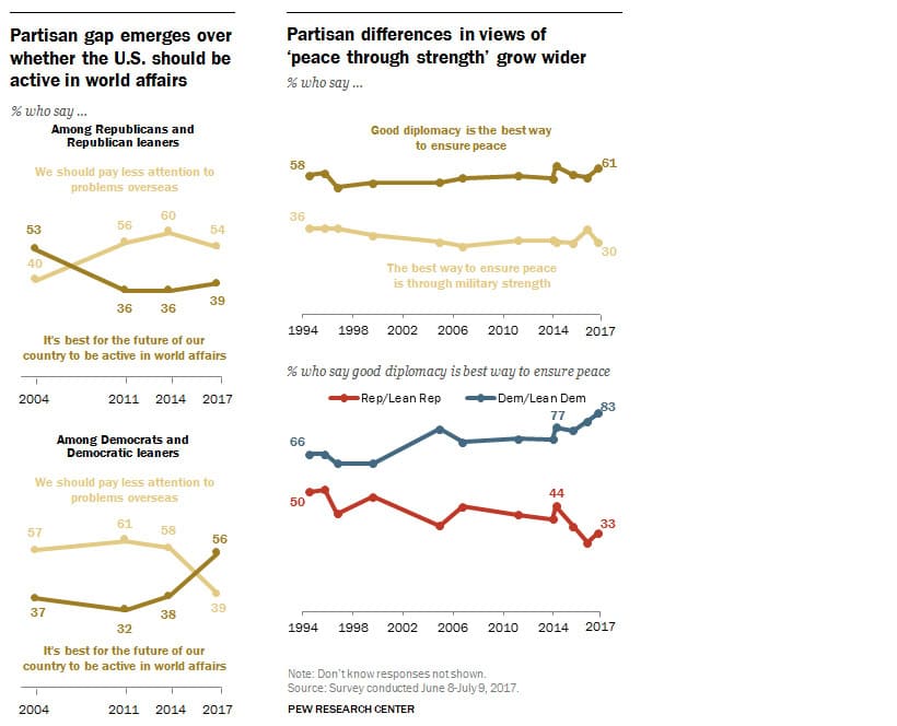 Americans are highly concerned about the U.S. presence on the global stage. Over half (56%) of Democrats think the U.S. should be active in world affairs, while 54% of Republicans think such attention should be focused inward instead of overseas.