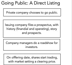 - If you choose the direct listing path, recognize that the public market may not agree with you on what you think your company is worth, and not only should you accept that difference and move on, you should recognize that this disagreement will be part of your public market existence for your listing life.