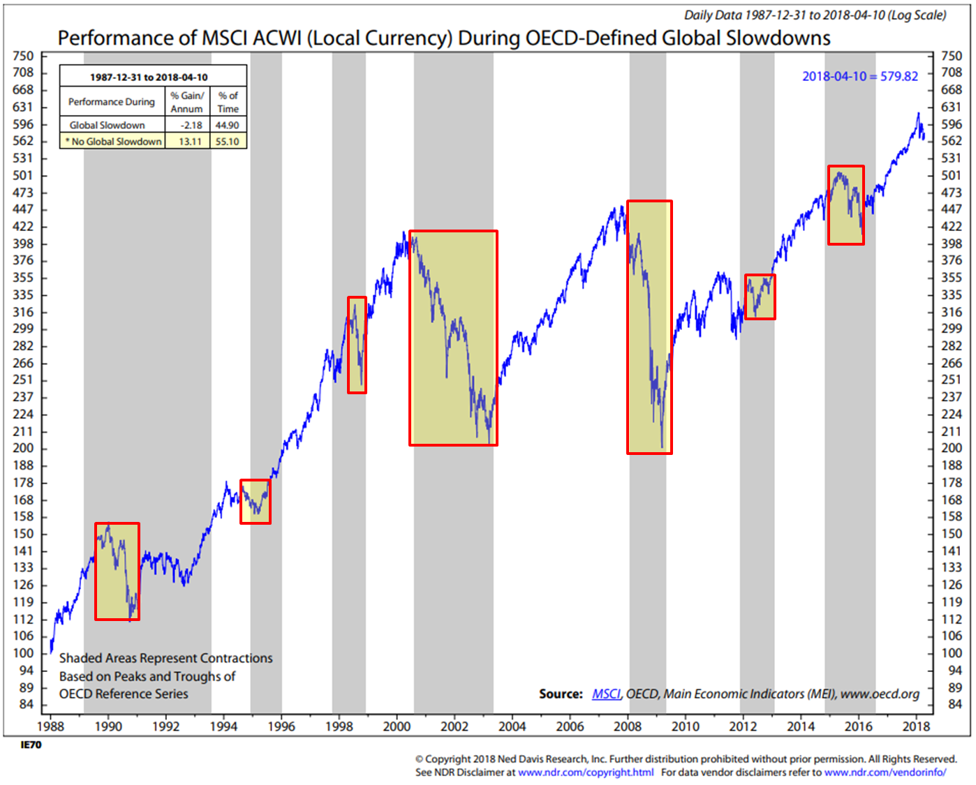 - The following chart plots the performance of the MSCI All Country World Index during global slowdowns (blue line).