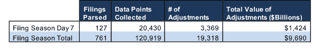 We pulled this highlight from yesterday’s research of 127 10-K filings, from which our Robo-Analyst technology collected 20,430 data points. Our analyst team used this data to make 3,369 forensic accounting adjustments with a dollar value of $1.4 trillion. The adjustments were applied as follows: