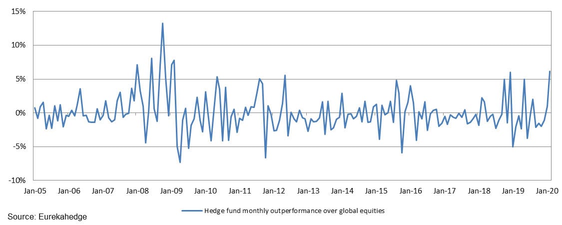 Figure 2: Monthly outperformance of the Eurekahedge Hedge Fund Index over global equities