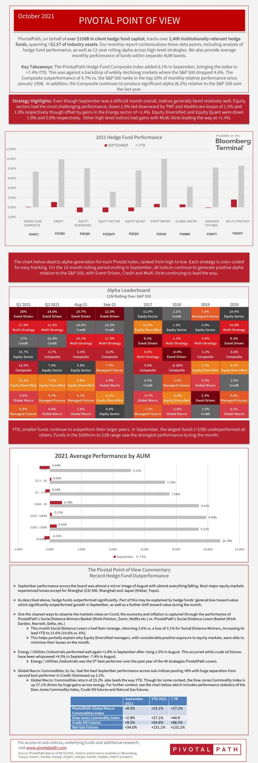 PivotalPath has released their monthly report, the Pivotal Point Of View, which measures performance among more than 2,400 institutionally-relevant hedge funds, as well as 40+ different hedge fund strategies and $2.5T in total industry assets. What were some of the big takeaways this one? For one, the PivotalPath Composite Index gained 0.1% in September – against a backdrop of widely declining markets where the S&P 500 dropped 4.6%. The Composite outperformance of 4.7% vs. the S&P 500 ranks in the top 10% of monthly relative performance since January 1998.