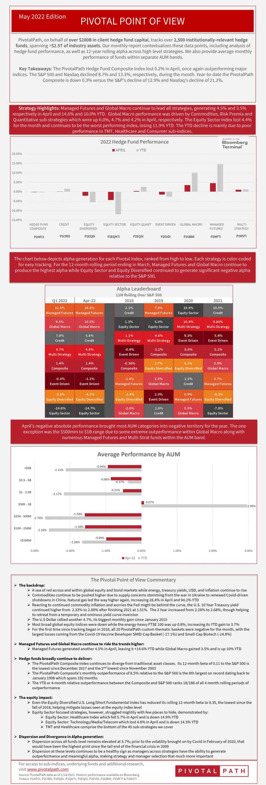 PivotalPath has released their monthly report, the Pivotal Point Of View, which measures performance among more than 2,400 institutionally-relevant hedge funds, as well as 40+ different hedge fund strategies and $2.5T in total industry assets. The big takeaway so far: despite a sea of red, hedge funds continue to outperform the broad market indices and maintain a historically low beta to the S&P 500.