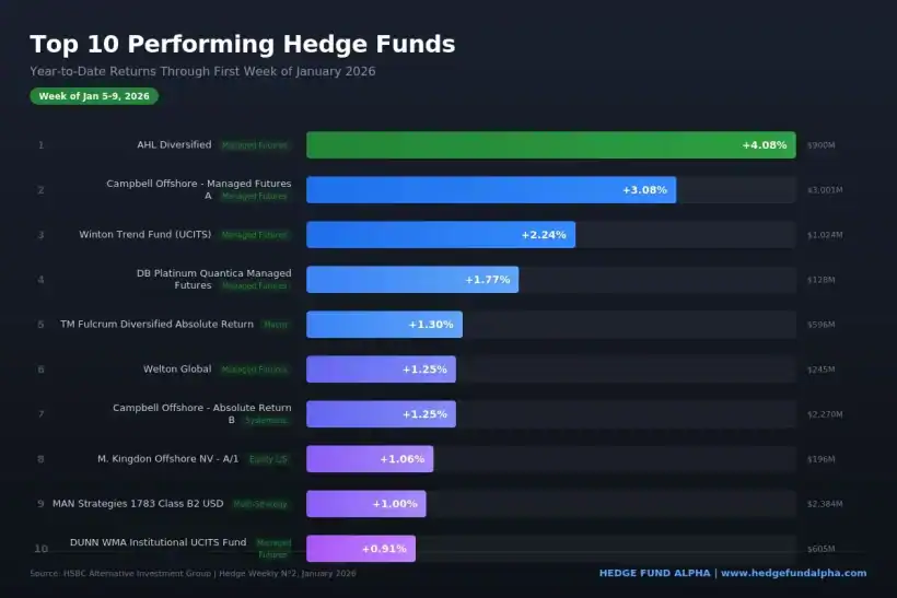 At the beginning of 2026, hedge funds from MAN Group (AHL Diversified and MAN Strategies 1783) and Campbell & Company best exploited market conditions. Also, there are funds from Winton, Quantica Capital, and Welton Investments, among others. Talking about the bottom performers is still early, and there is only one fund from IXI Fund Managers recording a detraction.