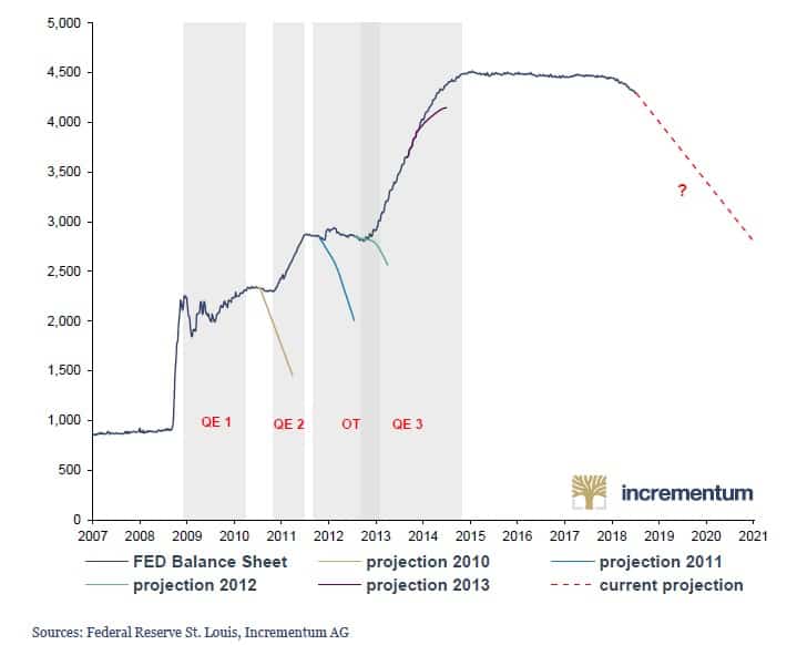 - So far, everything seems to be going according to plan: The balance sheet of the Federal Reserve has so far fallen by 7% or USD 308 bn to its lowest level since March 2014.