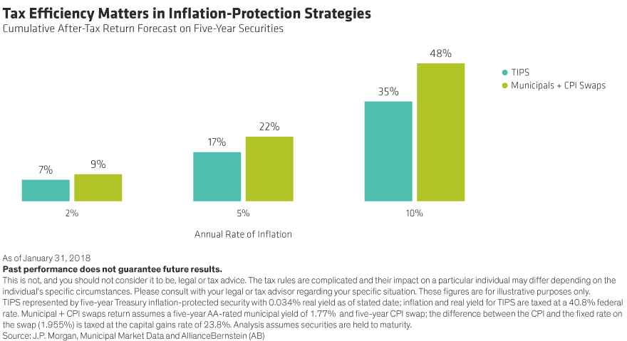 Fortunately, there’s another way. By combining tax-exempt (and not inflation-protected) municipal bonds and consumer price index (CPI) swaps, investors who pay taxes can tap into two very large and highly liquid markets. CPI swaps are agreements in which investors arrange to “swap” fixed interest payments for floating-rate payments tied to inflation rates, for a predetermined length of time.