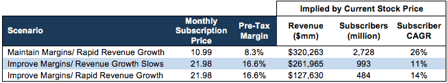 To further illustrate just how overvalued NFLX is, we quantify three scenarios for the improvement in margins, subscribers, and/or revenue that is required to justify NFLX’s current price of $307/share. For reference, Netflix currently has just under 119 million paying subscribers, and there are ~250 million potential subscribers (people 18 and above) in the United States.