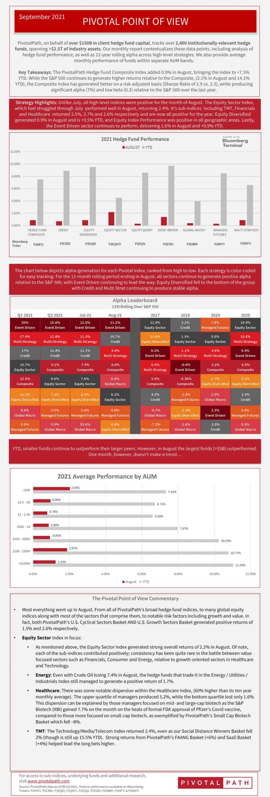 According to the latest research from PivotalPath, hedge funds stay the course, but in a reversal from the norm, larger funds outperformed in August.