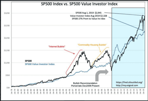 The Value Investor Index remains 27% premium to the SP500. Not excessive. This is a fundamental index based on the US Real Private GDP trend, the 12mo Trimmed Mean PCE and the long-term earnings trend of the SP500. Excessive market valuations correlate with premiums of 60%-100%+ and a high level of speculation coupled to enthusiastic market psychology. The term ‘euphoric’ does not describe today’s investing environment. Investors have been pessimistic since Jan 2018 with multiple market sell-offs on anticipated economic weakness which has not come to pass.