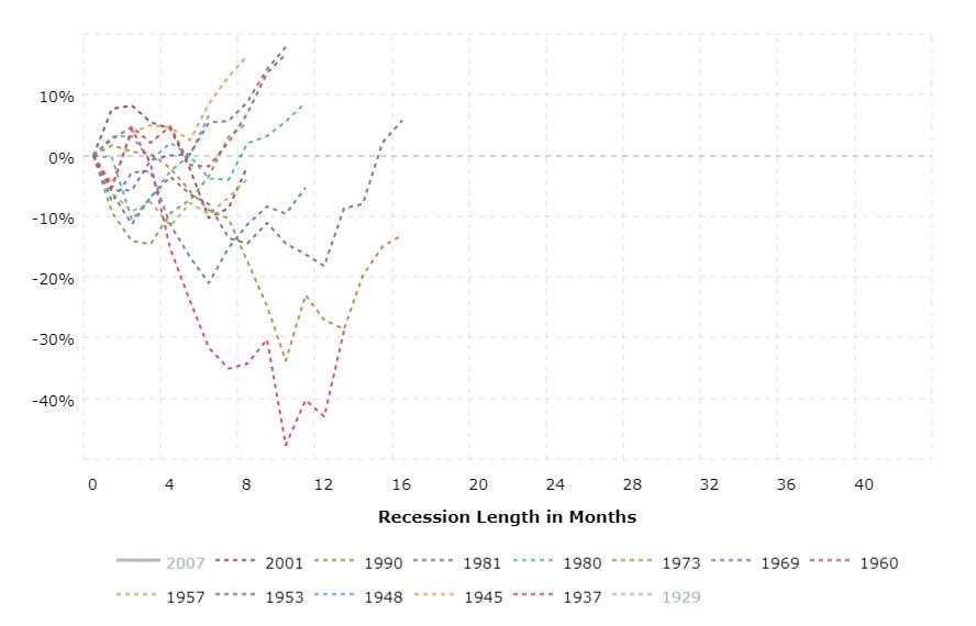 The chart below from Macrotrends is interesting because it shows the S&P 500’s performance in all the recessions besides the one that started in 1929 and the one that started in 2007.