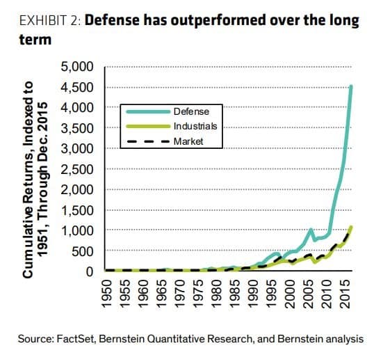 Even though there hasn’t been another world war, defense stocks have outperformed industrials and the overall market by over a factor of 4 since 1950. Selling to the U.S. government is a great business as it has access to the US taxpayers’ money. Considering the current fiscal deficit, as we discussed in a past article Government Won’t Save You, it will be interesting to see if this trend continues.