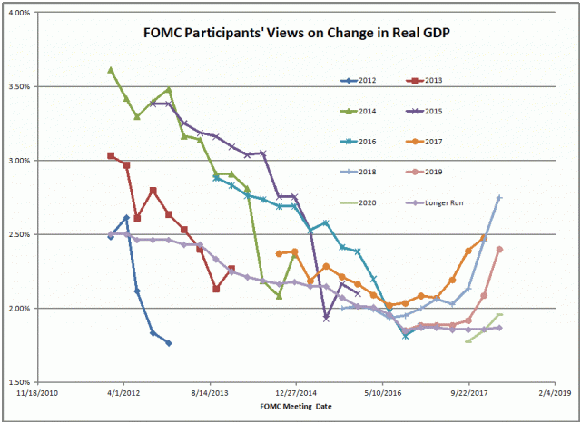Then there is PCE Inflation. Estimates by the Fed Governors are rising, and in 2019 and 2020 they exceed 2%. In the long run the view of the Fed Governors is that they can achieve 2% PCE inflation. Flying in the face of that is that they haven’t been able to do that for the duration of this experiment, so should we believe in their power to do so?