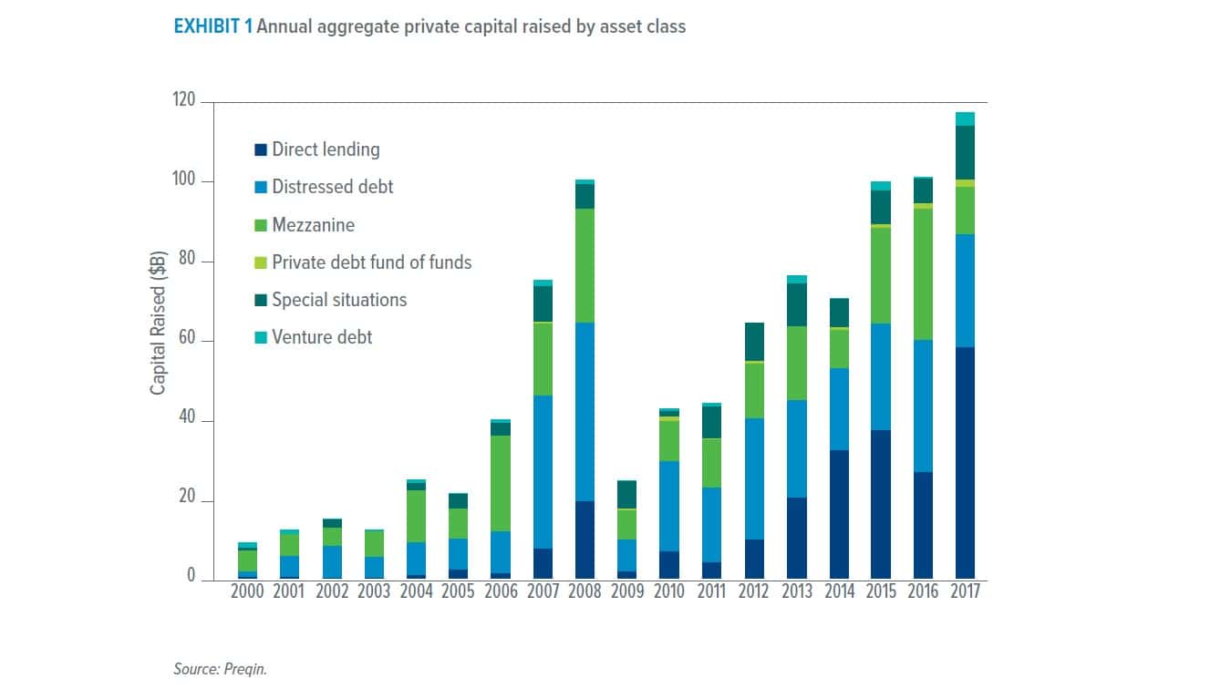 The phenomenal growth of private debt over the past decade can be traced back to the global financial crisis. Financial institutions needed to offload debt and the regulatory response included sharp increases to capital requirements. Both factors caused banks to curtail corporate lending and adopt a much more conservative approach to origination. Fund managers stepped into the breach, effectively replacing banks in the corporate lending landscape. Private equity sponsored deals have driven much of the growth, but nonsponsored loans are a growing part of the picture. In Europe, for example, nonsponsored loans accounted for over a third of overall loan volume in 2017, compared to less than 20% in 2007.2
