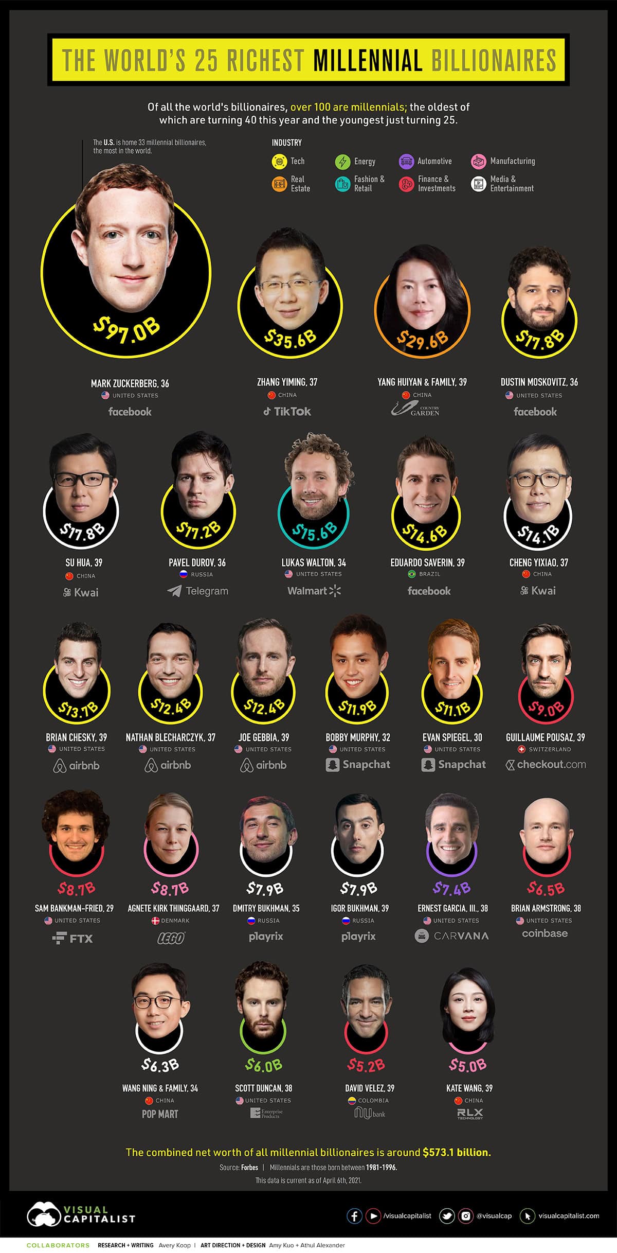 Note: Forbes categorized billionaires by current age (2021). For those slightly over or under the age range of Millennials, meaning those who are currently 24 or 40 years old (i.e. they could have been born in either 1996/1997 or 1980/1981), if their birth year could not be accurately determined, they were left out of this ranking.