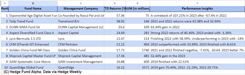 HSBC provides  publishes weekly reports on hedge fund performances, below are some stats drawn from their performance report published on May 17th 2024. Exponential Age Digital Asset Fund based on crypto and blockchain has been the top performer for several weeks in a row.