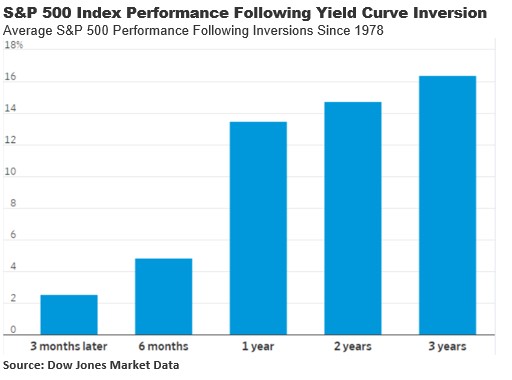 On average, the S&P 500 has returned 2.5% after a yield-curve inversion in the three months after the episode; it has gained 4.9% in the following six months; 13.58% a year after; 14.7% in the following two years; and 16.41% three years out, according to Dow Jones Market Data. That’s far from the disaster the mainstream media would have us believe! Take a look at the following chart: