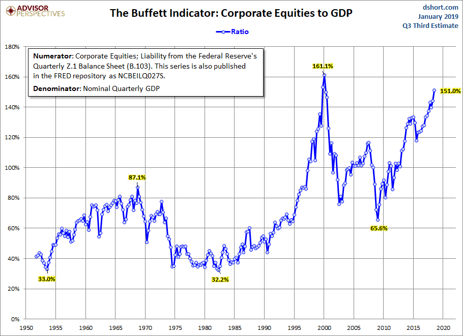 - First, the charts plots the overall valuation of stock market based on the number of shares each company has outstanding times their share price. Then add all of the company’s valuations together to get the total valuation of the stock market. Then compare the total value of the stock market to the Nominal Gross Domestic Income and you get a ratio. Think of Nominal Gross Domestic Income as all of our incomes added up together. Over time, the market should not get too overvalued relative to how much income the U.S. (you and me and everyone) collectively makes.