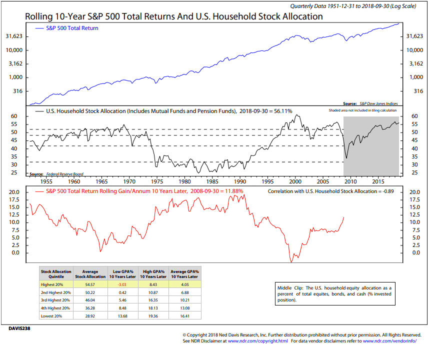 One of my favorite coming 10-year return charts has nothing to do with valuations. It looks at how much U.S. households have allocated to stocks as a percentage of their total portfolio.