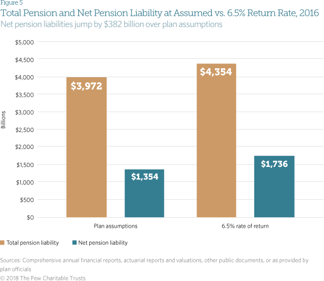 There is potentially good news on the horizon. Early reports indicate strong 2017 stock and real estate market performance could reduce reported unfunded liabilities. “However, that same market volatility could have an adverse impact in the long term, especially if lawmakers also fail to make adequate annual contributions to state plans,” the report warned, pointing out that even small changes to projected returns can significantly increase liabilities. Pew, for instance, applied a 6.5% return assumption, instead of the median assumption of 7.5% and found that it would grow liability to $4.4 trillion, or $382 billion more than the current amount. The funding gap would likewise balloon to $1.7 trillion.