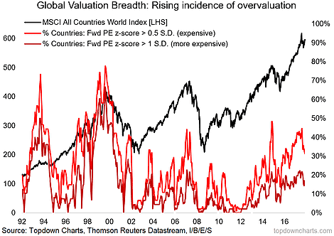 8. "One issue (along side the themes of a maturing business cycle and a turning of the tides in global monetary policy) is a rising incidence of overvaluation across markets (and assets). It’s not at previous extremes yet, and valuation is not by itself a reason for markets to fall, but it is an important fact to incorporate and reflects increasingly optimistic expectations on the growth outlook."