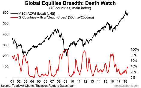 9. "Global death-cross watch: a nice & novel chart which tracks the proportion of markets which have a “death cross” (i.e. the 50-day moving average passing below the 200 day) across 70 countries. This is probably the most comprehensive breadth view of global equities and a key early warning chart (i.e. this indicator usually turns up leading into a correction - like it is now)."