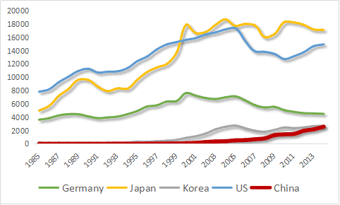 Unsurprisingly, the timing of the public hearing about Chinese IP and the IP debacle is escalating at a moment when Chinese companies are beginning to compete among world-class leaders, cutting-edge innovators, and lucrative brands. The shift, which some predicted over a decade ago, is reflected by an increasingly global struggle for innovation. Two decades ago, China was still far behind the United States, Japan, South Korea, and Germany—the world’s leading innovators—in total patent applications. Now it is ahead of all of them.
