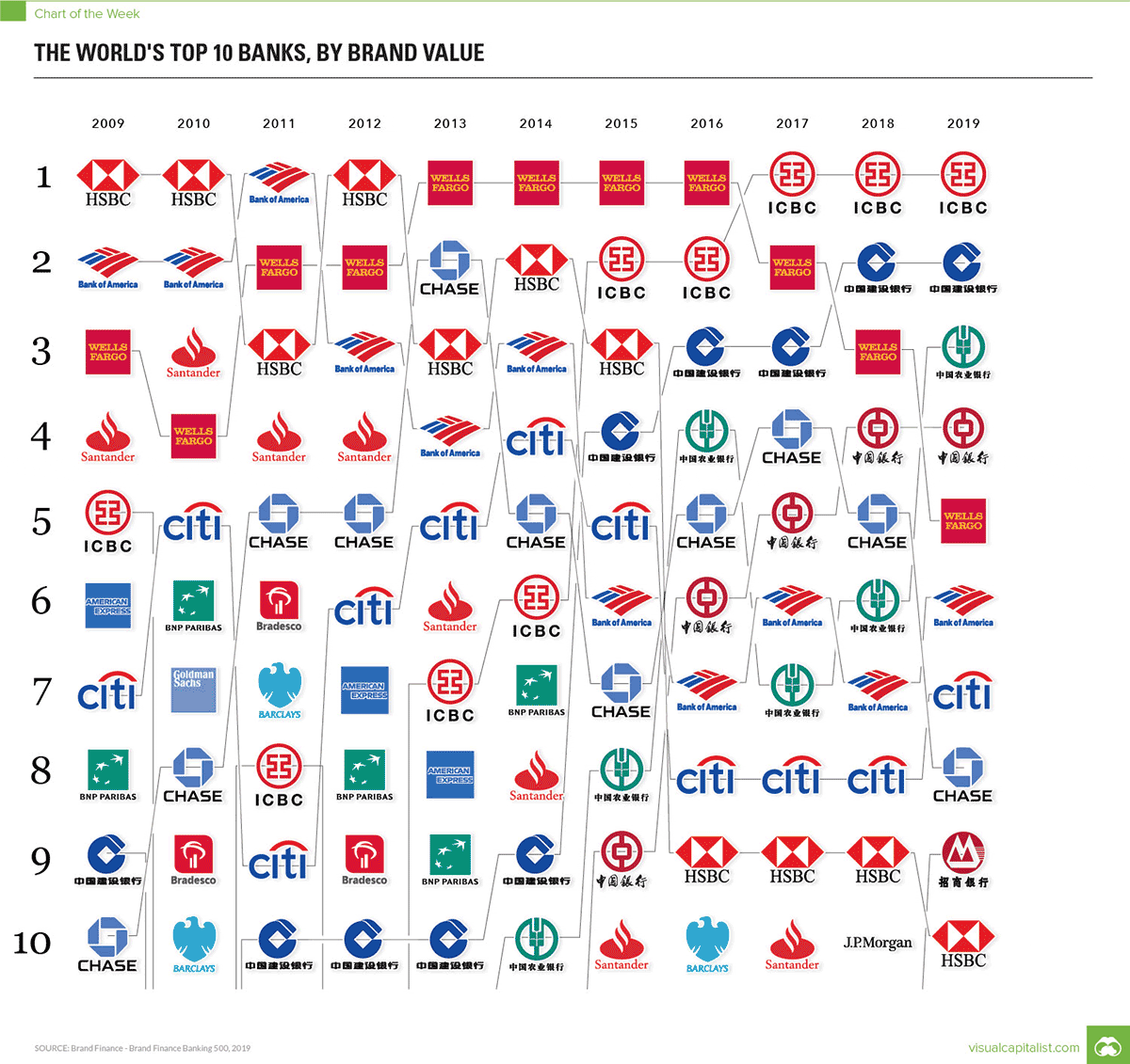 Here are the top bank brands by value in 2019: