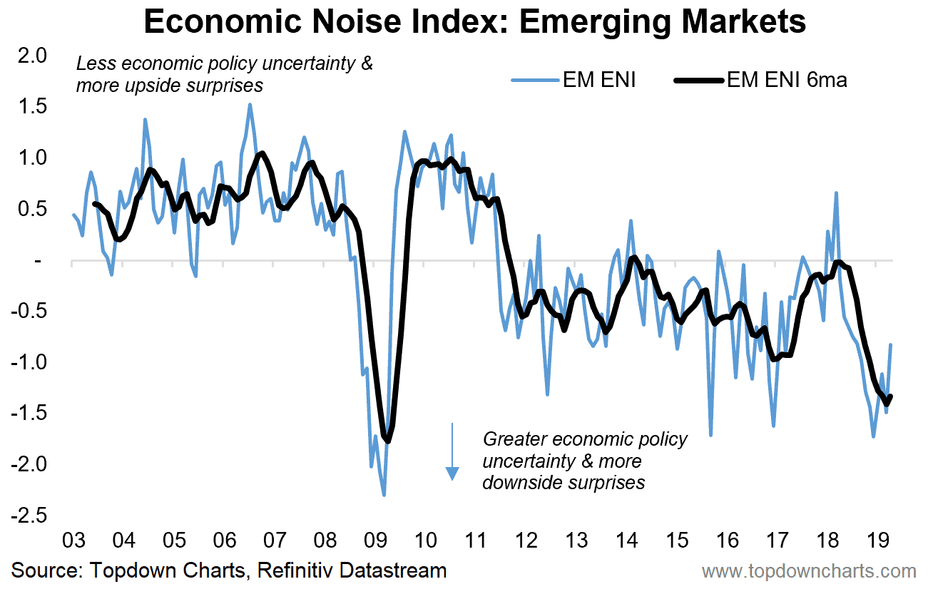 2. Economic Noise Index -- Emerging Markets:Those who follow my work know I am fond of designing the occasional weird and wacky indicator, and here's a good example. I call it the "Economic Noise Index", and basically it combines the signal from the economic policy uncertainty index and the economic surprise index.