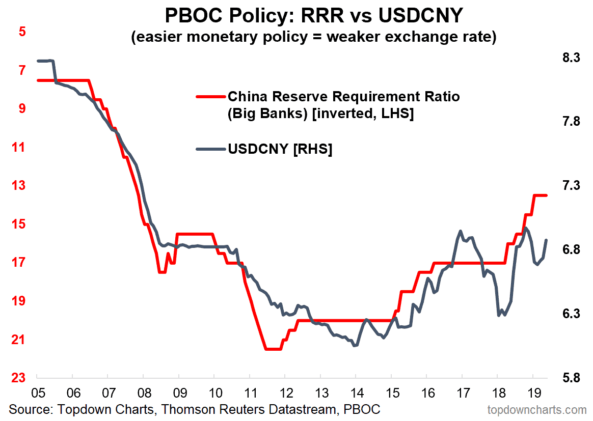 3. Chinese Yuan Devaluation = Path of Least Resistance:I can't not talk about the Renminbi, and indeed I covered it in my Monday markets monitor. Below is one of the charts I pointed to, which shows the RRR inverted against the USDCNY. The punchline is that policy easing tends to put the CNY on a weakening path. Of course the thing that really got the USDCNY on the move is obviously the trade-deal break-down.