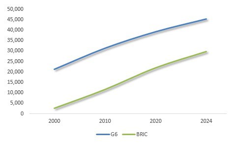 Figure 2: G6 Economies and the BRICs’ Catch-Up, 2000-2024