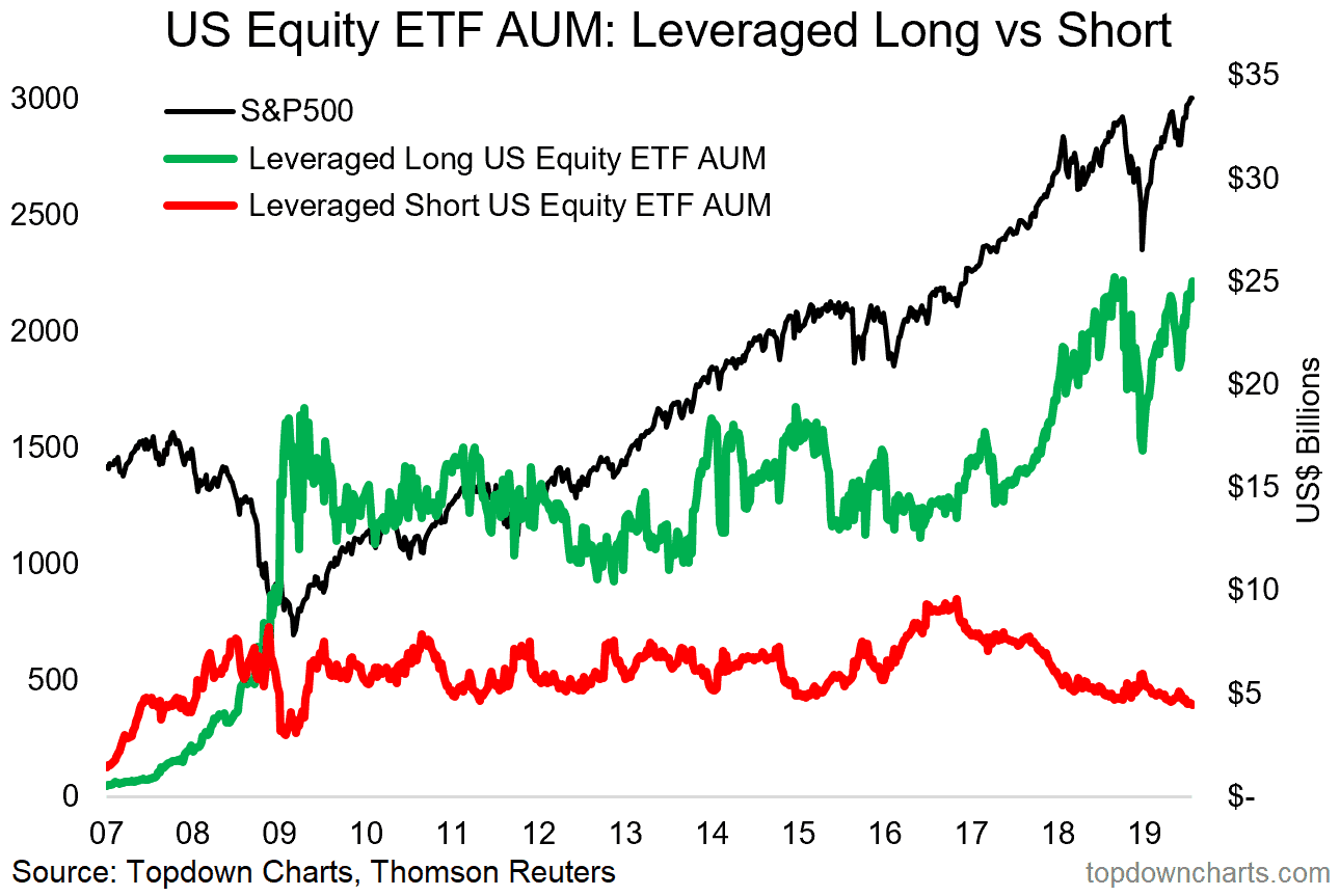 A couple of things are worth highlighting here: first, leveraged short ETF AUM has continued to drift lower, and leveraged long ETF AUM has remained on the high side. This is one piece of evidence which arguably points to at least the cohort of investors using these instruments as running a bullish outlook on equities...