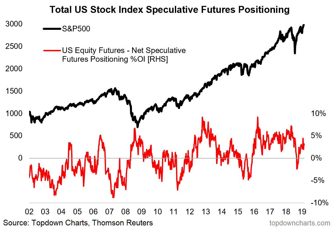 This chart shows the aggregated normalized (against open interest) net-speculative futures positioning for US equities.
